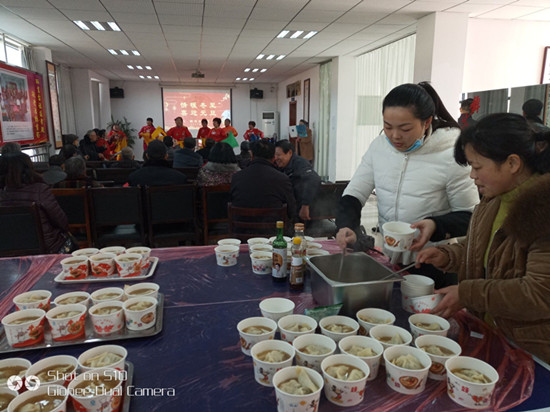 精彩的节目上演的同时,社区的志愿者忙开了,因为当天是冬至,大家正在手脚麻利地包着饺子,社区书记杨耀华也加入到包饺子的行列。