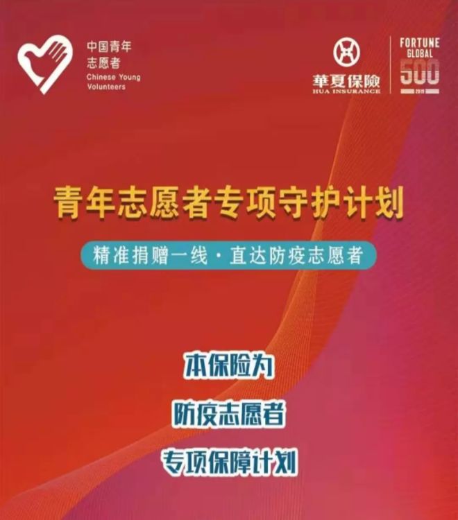 华夏人寿保险股份有限公司为全国各地疫情防控青年志愿者提供防疫志愿者专项保险50万份。凡参与各级共青团组织和团属青年志愿者协会发布的新型冠状病毒感染肺炎疫情防控相关志愿服务项目的、年满18周岁的青年志愿者自愿申领保险后,均可获得保障。