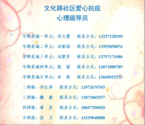 基于辖区居民因长期隔离在家情绪不稳定的新情况,社区成立了由9名社区志愿者组成的爱心抗疫心理疏导员团队,在各小区微信群里公布心理疏导员的姓名和联系方式,适时引导居民进行情绪排解,疏导化解负面情绪,回应居民的诉求,缓解居民的精神压力。