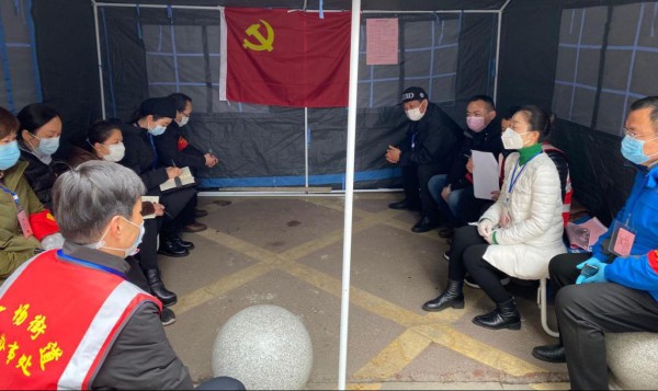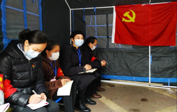 2020年3月6日,广场街道文化路社区党委在辖区内水利巷卡口开展了一次抗疫一线的支部主题党日活动,社区党委书记、各临时党支部书记等共16名党员参加了活动。党员们重温了入党誓词,学习了《省委书记应勇同志关于抗疫工作的讲话精神》、《市抗疫指挥部关于在新冠肺炎疫情防控工作中严肃舆情传播纪律的紧急通知》;社区党委宣布了社区新冠肺炎疫情防控各临时党支部的组成人员名单,明确了工作职责;临时党支部各位书记结合各自的工作实际,谈了建议和想法,纷纷表示坚决支持社区党委的各项决议,恪尽职守,努力发挥好支部的战斗堡垒作用和党员的先锋模范作用,做实做细做好所管区域的抗疫工作,同舟共济、不懈努力,终会迎来疫情防控工作的最终胜利!文化路社区党委书记肖潇同志充分肯定了前期市区工作队员、党员干部志愿者和社区工作者所做的艰苦工作和取得的成绩,阐述了建立临时党支部的重要性、必要性,强调了各位支部书记的职责担当,对各位支部书记好的想法和建议给予了赞赏和积极回应,对组建爱心抗疫心理疏导团队做了专门部署。