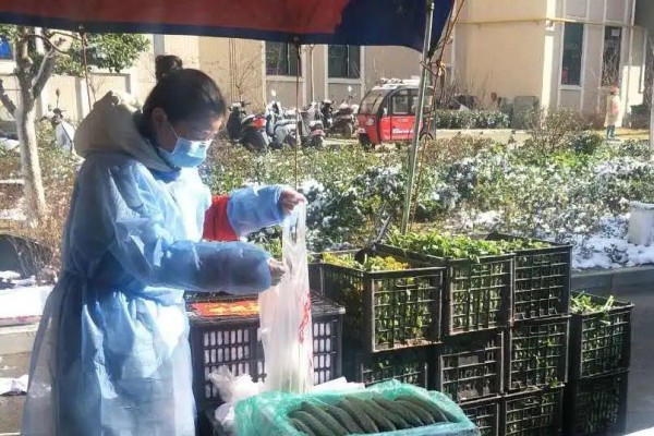 在新华街道联城社区,党员干警周丽霞报到后,负责居民生活物资分发配送和社区巡逻。在临时搭建的帐篷内,周丽霞与志愿者们一起将爱心蔬菜和社区批发的蔬菜,统一集中分装,按照楼栋编号,在微信群里按栋数呼叫居民,每家每户一个人做为代表下楼领菜,一栋分发完再喊下一栋居民下楼,控制人口流动,避免群众大量集中。