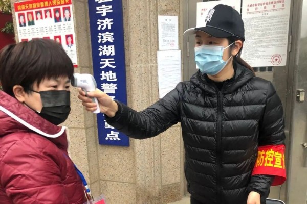 在宇济宾湖天地,区法院党组成员、副院长代绍娟正在给出入工作人员测量体温。疫情防控工作开展以来,她每天都坚守在一线,切实发挥出党员干部模范带头作用。