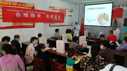 在永新社区、书院学校参与健康知识讲座活动的有老年人、慢性病患者、计生特扶家庭及社区工作人员和在校复工复课的教师、学生。中心公卫科工作人员通过悬挂横幅,摆放宣传展板,发放知识健康折页等形式进行现场宣传,公卫科医生秦娜结合当前疫情,有针对性的重点阐叙了强化合理膳食、增强免疫力、防控疾病的重要意义等相关知识,倡导“三减”(减油,减盐,减糖),提倡分餐制和使用公筷公勺等饮食风尚,倡导个人卫生、文明的饮食习惯,坚决杜绝食用野生动物陋习,传承中华优良饮食文化,树立饮食新风,助力健康湖北建设。