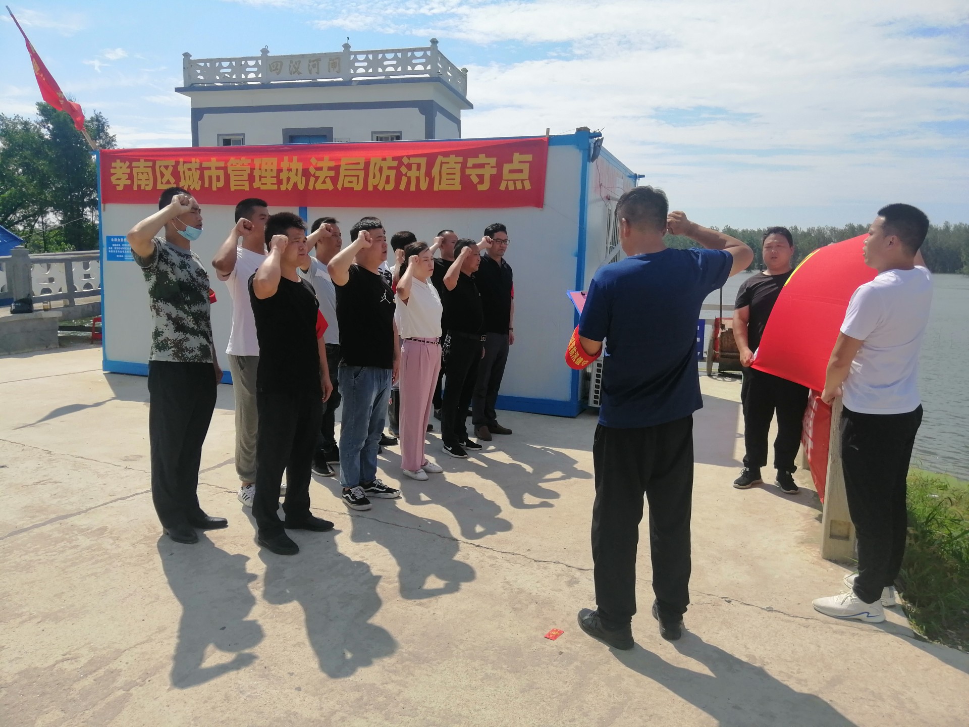 7月22日,一场特殊的“支部主题党日”活动在朱湖沦河大堤四汊闸召开,孝南区城市管理执法局党组3名班子成员及防汛突击队11名党员干部参加。