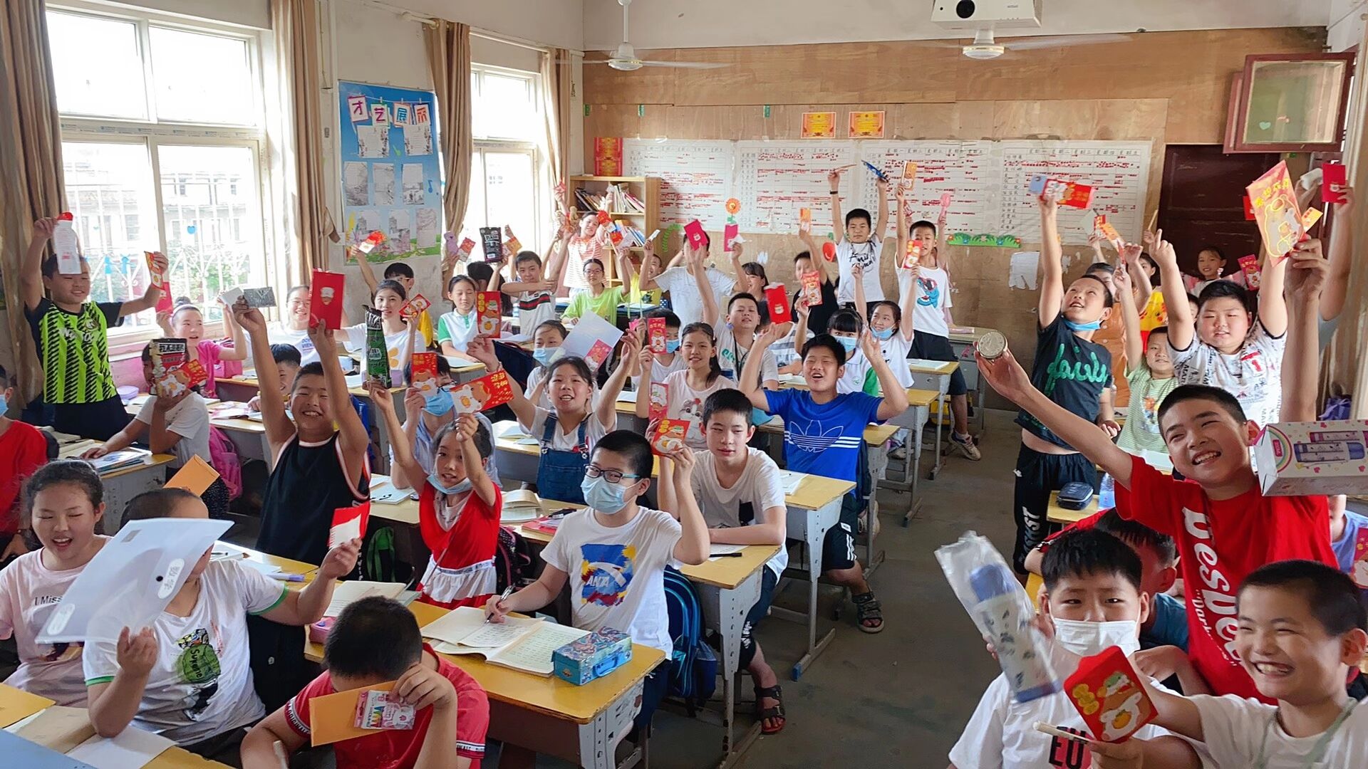 当孩子们打开“红包”看时,发现里面装的不是人民币,而是一份写着不同内容的小卡片。“笔记本”、“钥匙扣”、“零食”、“粘钩”……每位同学纸条上的内容都不一样。刘老师告诉笔者,“疫情期间太想念我的学生,很早我就筹划开学给他们送点礼物,毕竟他们也太不容易了,只想给他们带来一份惊喜!”拿到红包的“神兽”们,兴奋地在教室里欢呼起来!