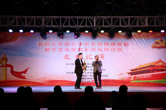 为深入学习贯彻党的十九届五中全会精神,繁荣和发展文化事业,促进满足人民文化需求和增长人民精神力量相统一,12月4日,孝南区“党的十九届五中全会精神进基层暨文艺志愿者送欢乐进社区文艺汇演”来到孝感市大润发超市广场,为闻讯而来的200多名群众献上了一场精彩纷呈的文艺盛宴,演出现场气氛热烈,为寒冷的夜晚增添了温暖。