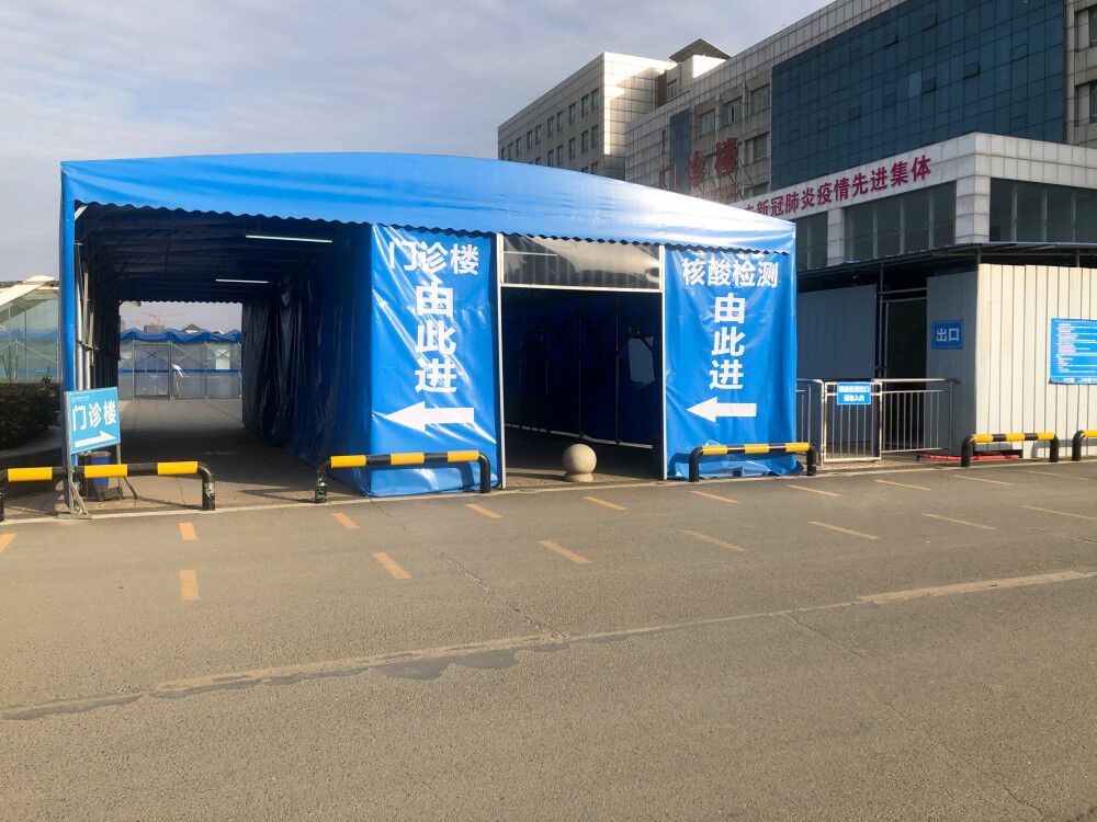 进入医院后,一个蓝色大棚子映入眼帘,棚内被分隔开为两个通道,入口一侧分别贴着“门诊楼由此进”和“核酸检测由此进”的白色大字。