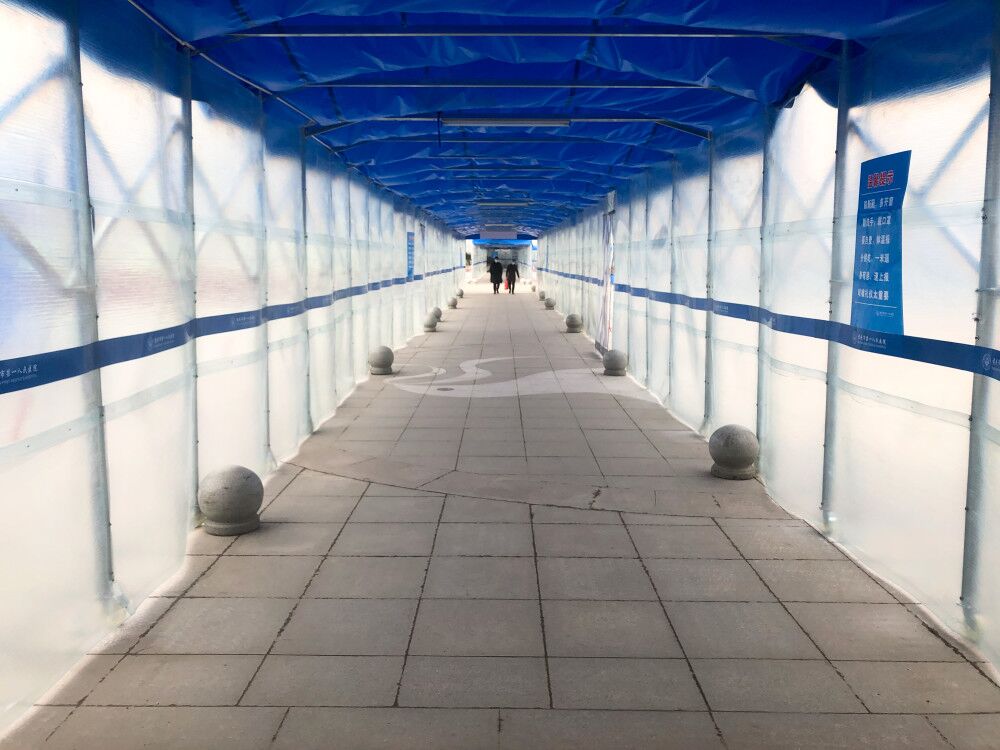 从门诊出口单通道出来,笔者看到在门诊楼通往住院部路上,有一个近4米宽、蓝顶、两侧透明的棚子,它在形成通道的同时,也为行走在里面的人带来一丝温暖,但间隔2米处,也同样会出现防控的温馨提示宣传牌。