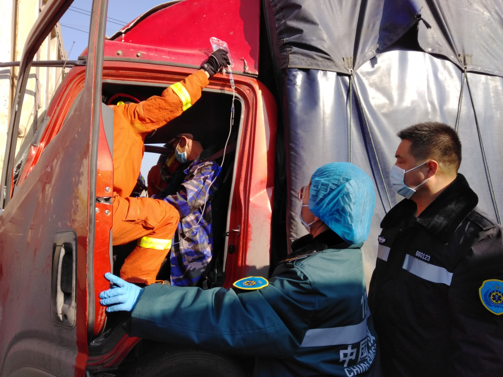 到达现场后,医护司发现是一辆货车追尾前车,造成货车驾驶室严重损坏变形,玻璃碎了一地,驾驶员被卡在驾驶室内动弹不得。