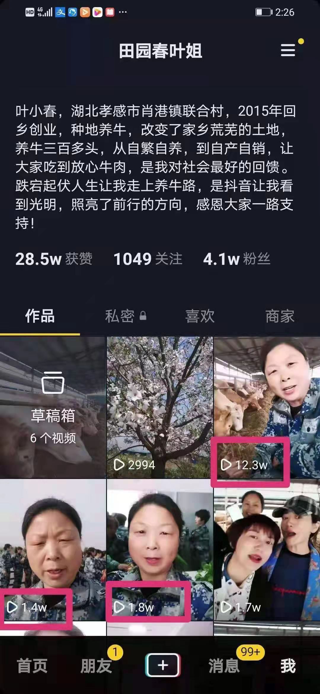 3月19日,孝南区农广校在新铺镇举办了为期七天的巾帼直播电商培训班。叶小春得知消息后,每天驱车20余公里前往参加培训,课堂上,授课老师了解她的情况后,进行了针对性的强化训练,短短几天的时间,叶小春以“田园春叶姐”(抖音昵称)创作的短视频连续上了大热门,累计播放量30多万,一次性精准涨粉过万人,粉丝突破4.1万。