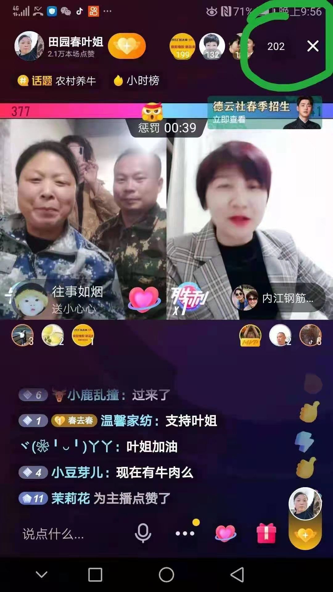 “今天是我第一次开直播,想和大家分享一下我的养牛技术和养牛过程,希望大家伸出你发财的小手,左上角帮我点个关注。”在第五天学习完直播技术后,“田园春叶姐”首次开播就登榜孝感同城的首位,直播间同时在线200多人,成功晋级抖音达人主播!
