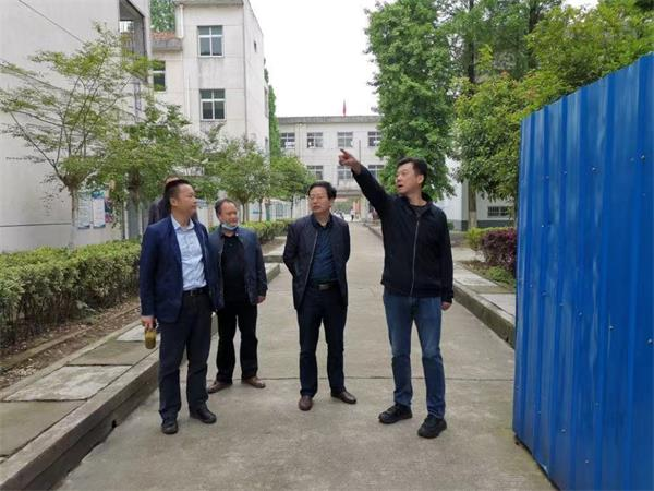 党史学习教育中,办事处主任黄志辉(左一)与孝南区教育局局长刘向东(右二)一起,在朱湖中学现场办公。