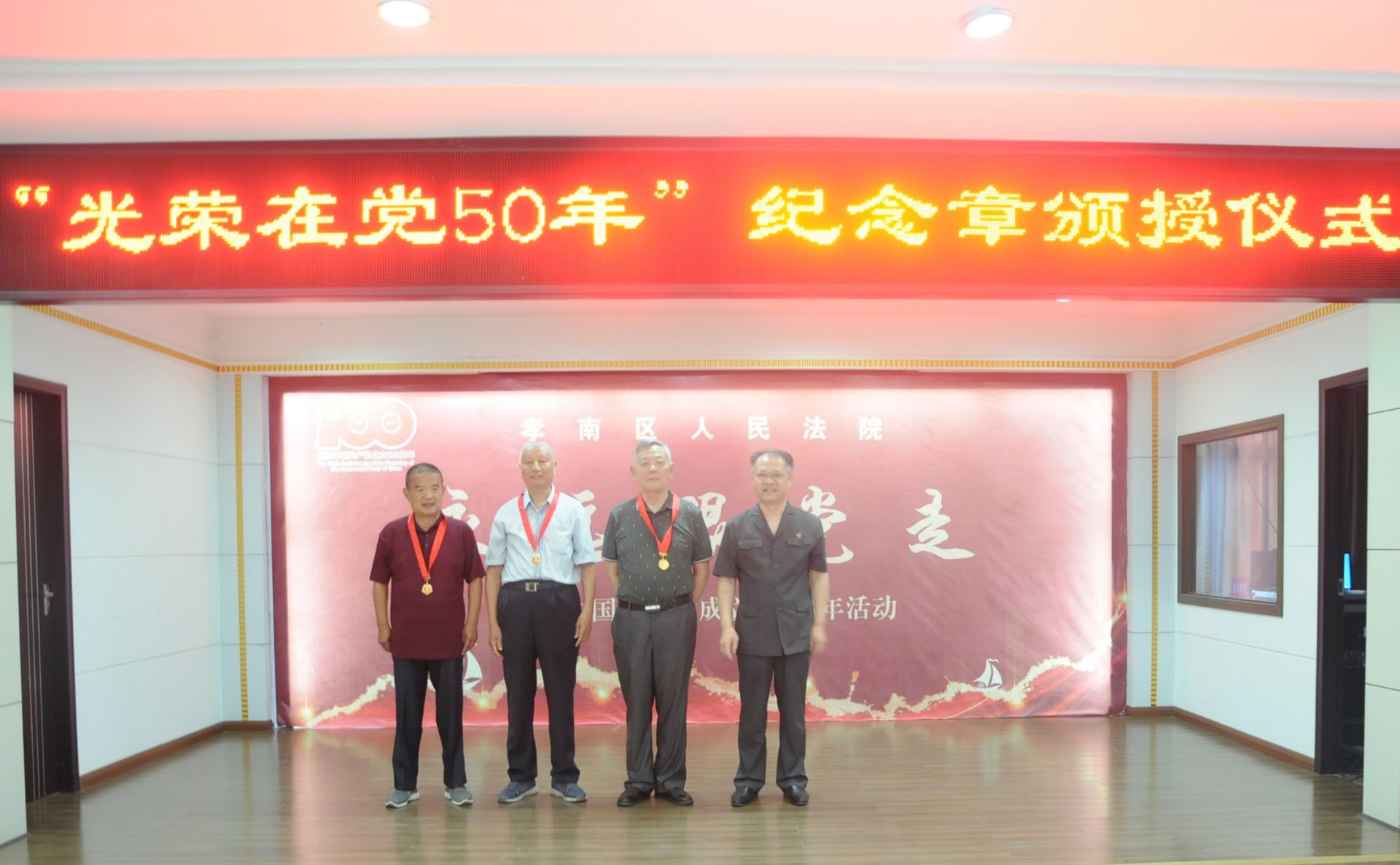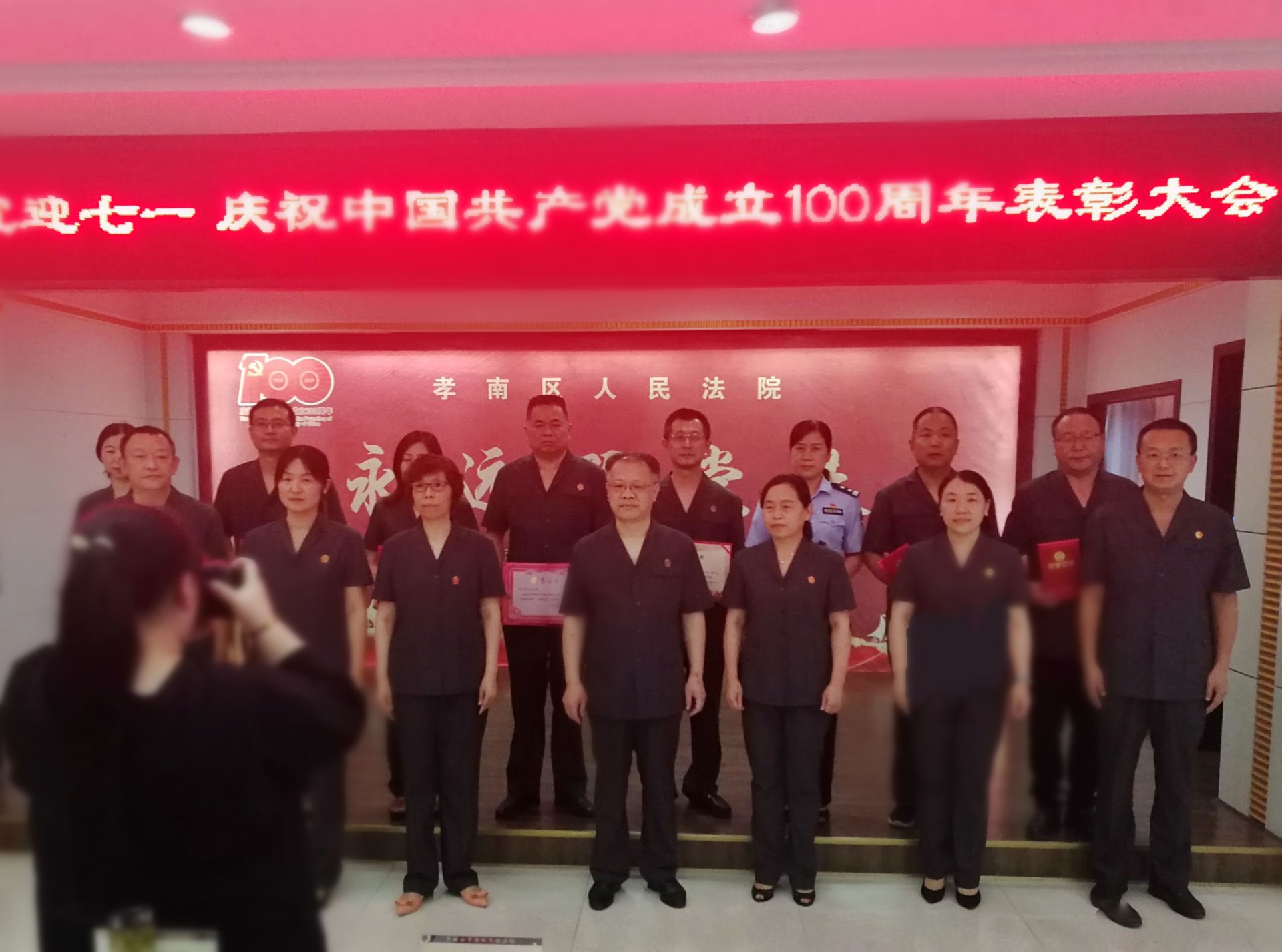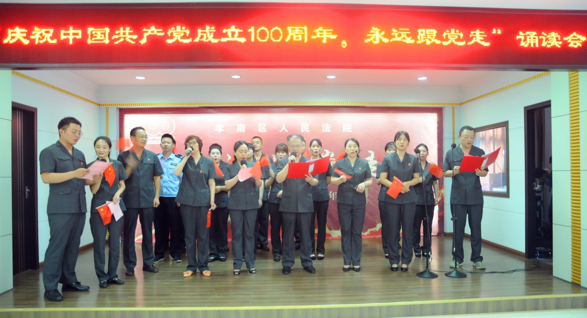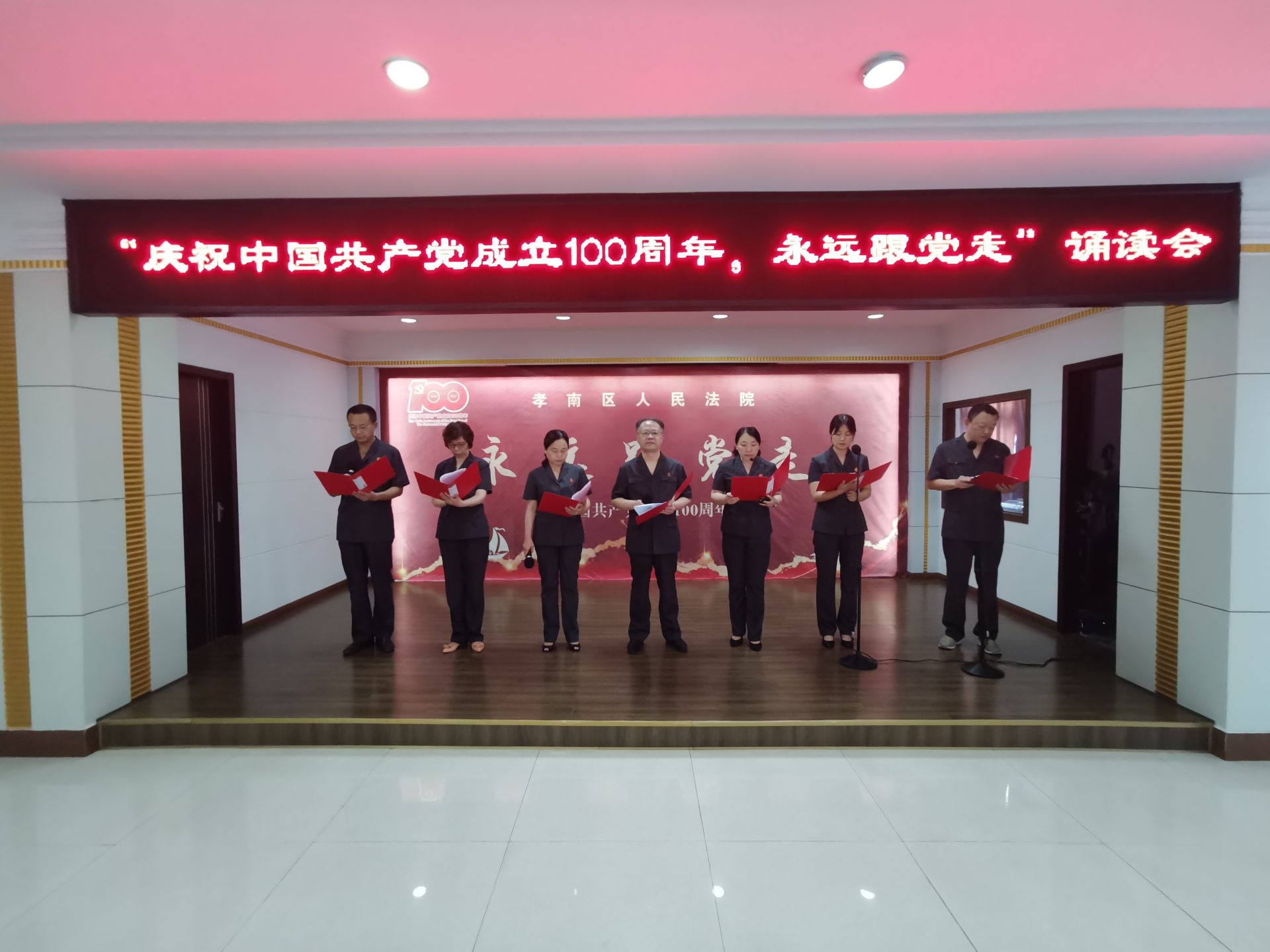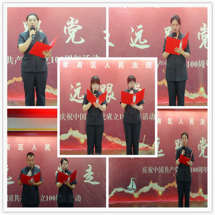 为庆祝中国共产党百年华诞,展示孝南法院党员干警砥砺奋进的雄心壮志,6月24日下午,孝南区法院召开“七一”表彰大会暨“永远跟党走”红色诗歌诵读会。此次会议分为表彰先进、向老党员致敬和诵读红色诗歌三个部分,全体干警参加会议。