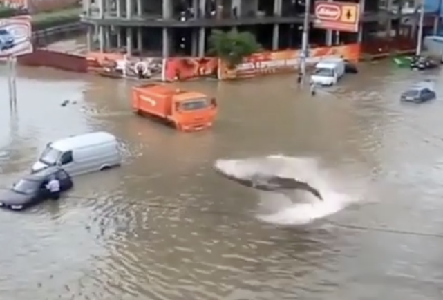 20日晚间,社交媒体上流传一则4秒钟的短视频,显示一条巨大的鱼状物体在街区洪水中翻腾,据称是郑州“荥阳海洋馆被冲破,海洋馆鲨鱼逃出来”。