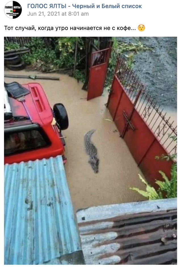 一个俄罗斯社交账号在6月21日已经贴出了这张图,所以结论就是,“郑州暴雨海洋馆爆炸,鳄鱼跑出来吃人”也纯属谣言。