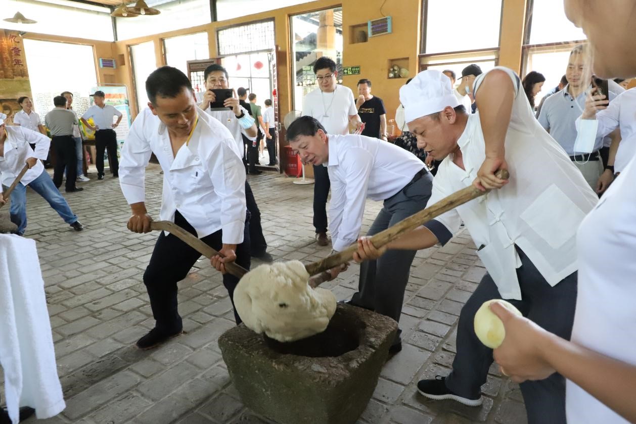“要压着石边转一下的挤压,这样更省力,打糍粑是个力气活,更是个技术活,这样在石臼里面通过人工打出来的糍粑具有颗粒感,吃起来味道很好。”道店民俗村里,考察组一边听介绍,一边尝金果、吃鲜桃、打糍粑……大家忙的不亦乐乎。