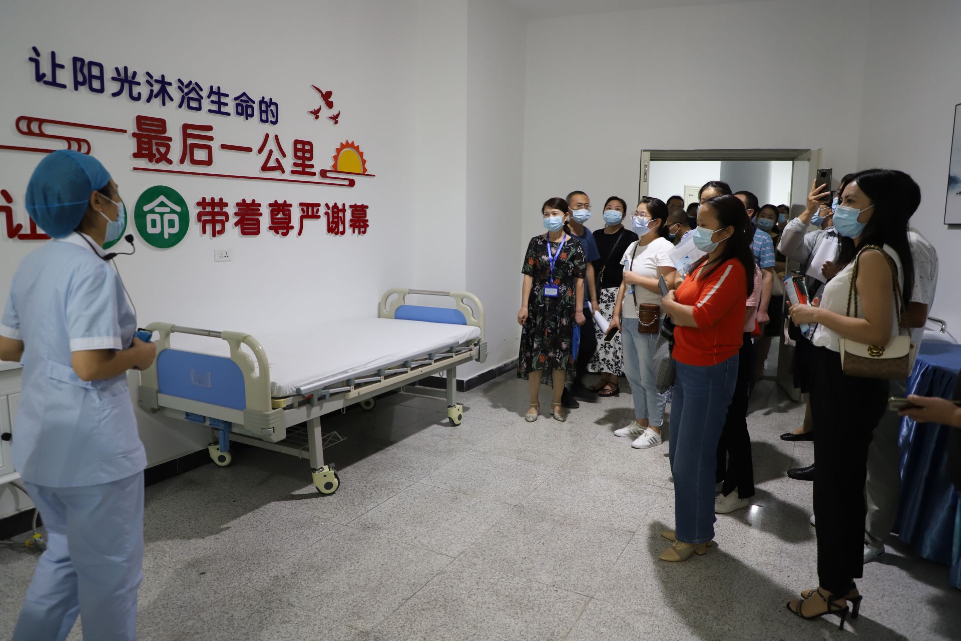 随后,参会人员到孝感市第一人民医院安宁疗护中心,在中心护士长刘惠林的引导下,参观了接待区、谈心区、舒缓区及病房等多功能区域,详细介绍了中心特色、服务亮点等工作,特别是对临终患者的姑息治疗和安宁疗护、医疗护理临床内涵、人文关怀等各方面进行了毫无保留地推介。