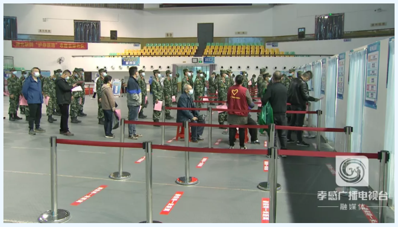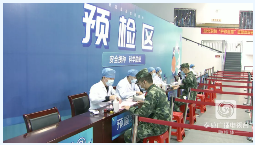 市体育中心是孝感城区大型新冠疫苗方舱接种点,由市中心医院负责。在接种现场,不少市民和武警官兵佩戴口罩有序排队,按照接种流程规范有序进行疫苗接种,现场秩序井然。