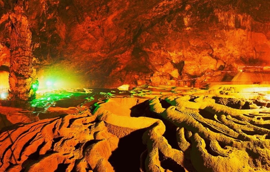 洞内钟乳石比皆是,形态各异,石笋、石柱、石幔、石瀑、石芽、石帘,分别呈红、黄、白、褐等色,如玉似翠,景致诱人,色彩绚丽,扑朔迷离。