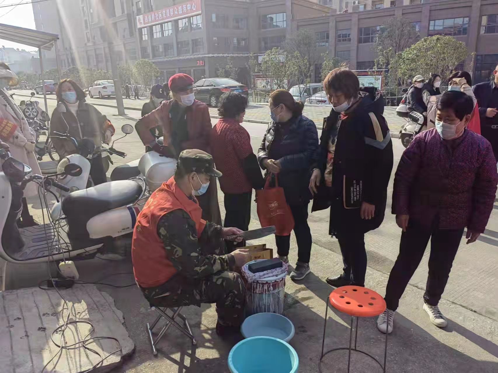 上午九点,孝南区退役军人志愿服务队的志愿者们来到指定地点,有条不紊地开展志愿活动。他们有的手拿扫帚,清扫路面;有的给社区居民磨刀;有的给路人发放医用防护口罩;有的在澴河公园除杂草;有的在给居民义务理发;还有的替老人搬重物、修电器。