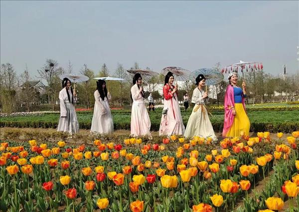 金卉庄园景区“阳光花海”人潮如织,游客们纷纷在盛开的郁金香花从中赏花、拍照