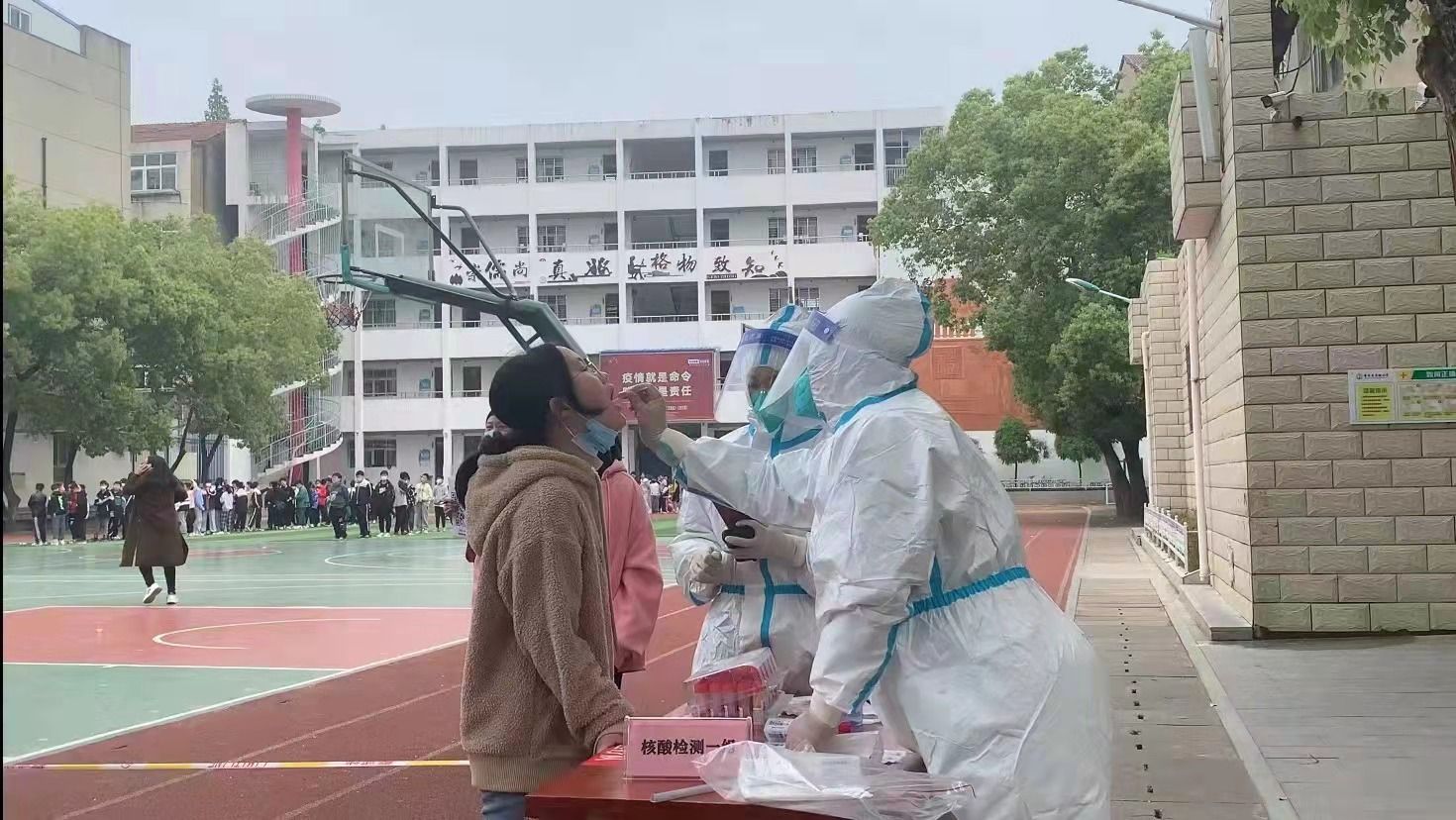 学生作为本次孝感城区24小时核酸筛查实战演练第一批采集对象之一,由于人员密度大、流动大,由对口医疗机构安排核酸检测组上门服务,而在孝南区实验小学的学生们正迎来孝感中医院的“大白”们。面对一位位身穿白色防护服的核酸检测人员,孩子们没有丝毫胆怯,而是兴奋地挥手打招呼,操场上“啊啊啊啊”的声音此起彼伏,汇聚成一段欢快的旋律。