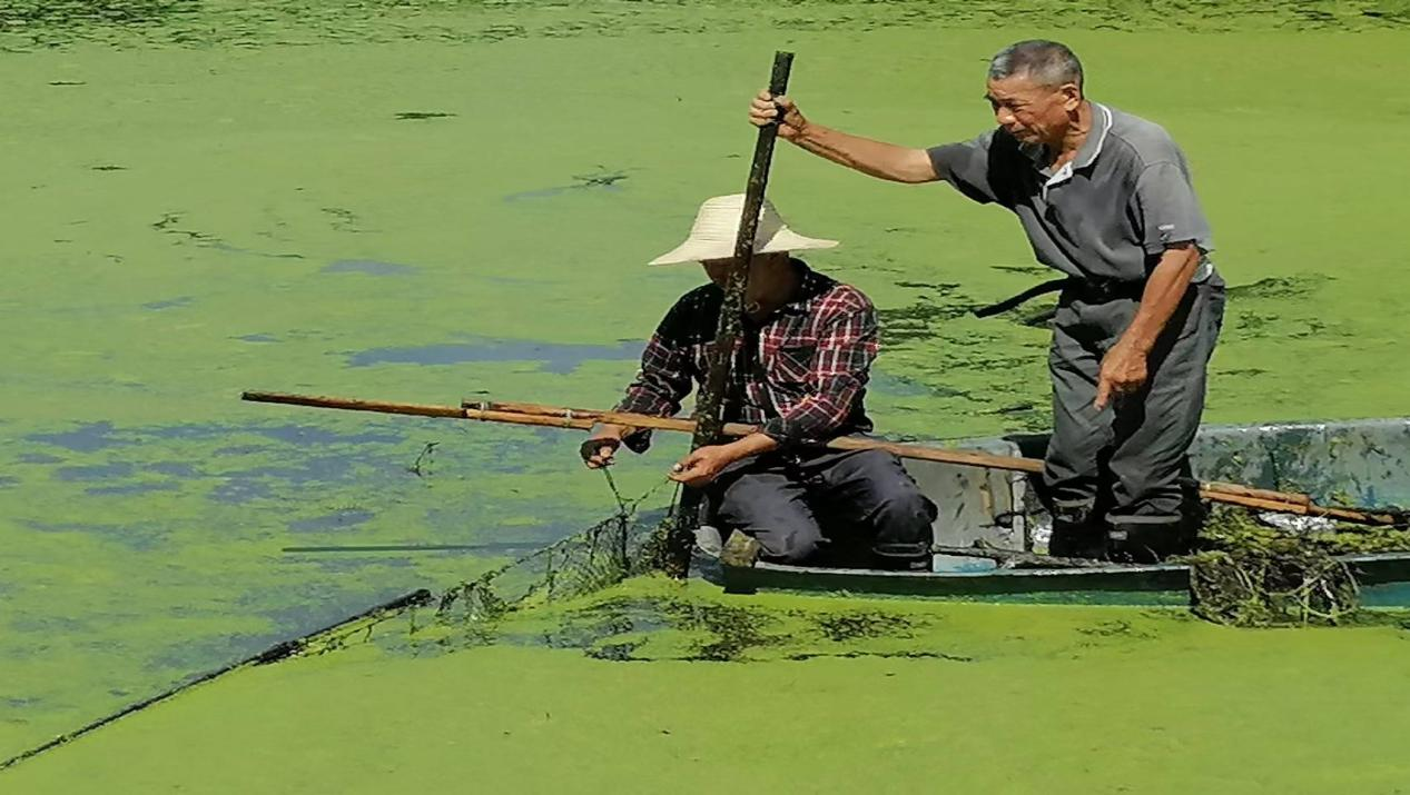 竹子港村内河管理区域因管辖距离较长,同时,由于桥西泵站抽水农田抗旱,流入内河的杂草较多,打捞人任务很是繁重。为了清除水草,管理人员在出水处安装铁网拦草和白色垃圾,河中心采取分割式打捞,利用塑料拉网固定在河的两侧,防止天气变化,湖面刮风水草到处漂。分为两人一组,两组同时行动,第一组在竹竿上绑上绳索,迎水面顺着一个方向把垃圾、水草拢在一起,另一组将其打捞到船上运至岸边,两组配合默契,共同努力将河面清理干净。