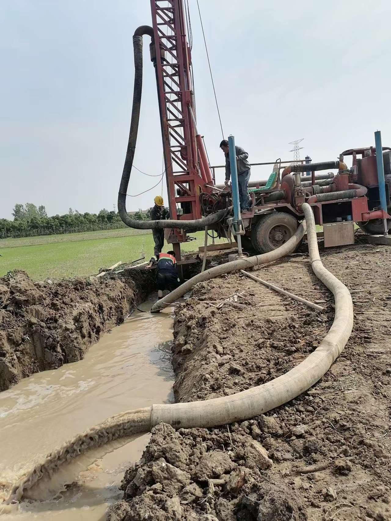 在朋兴乡和平村田间打井现场,机器传来阵阵轰隆声,施工队正在紧张忙碌着打,井机器正在田里打井。