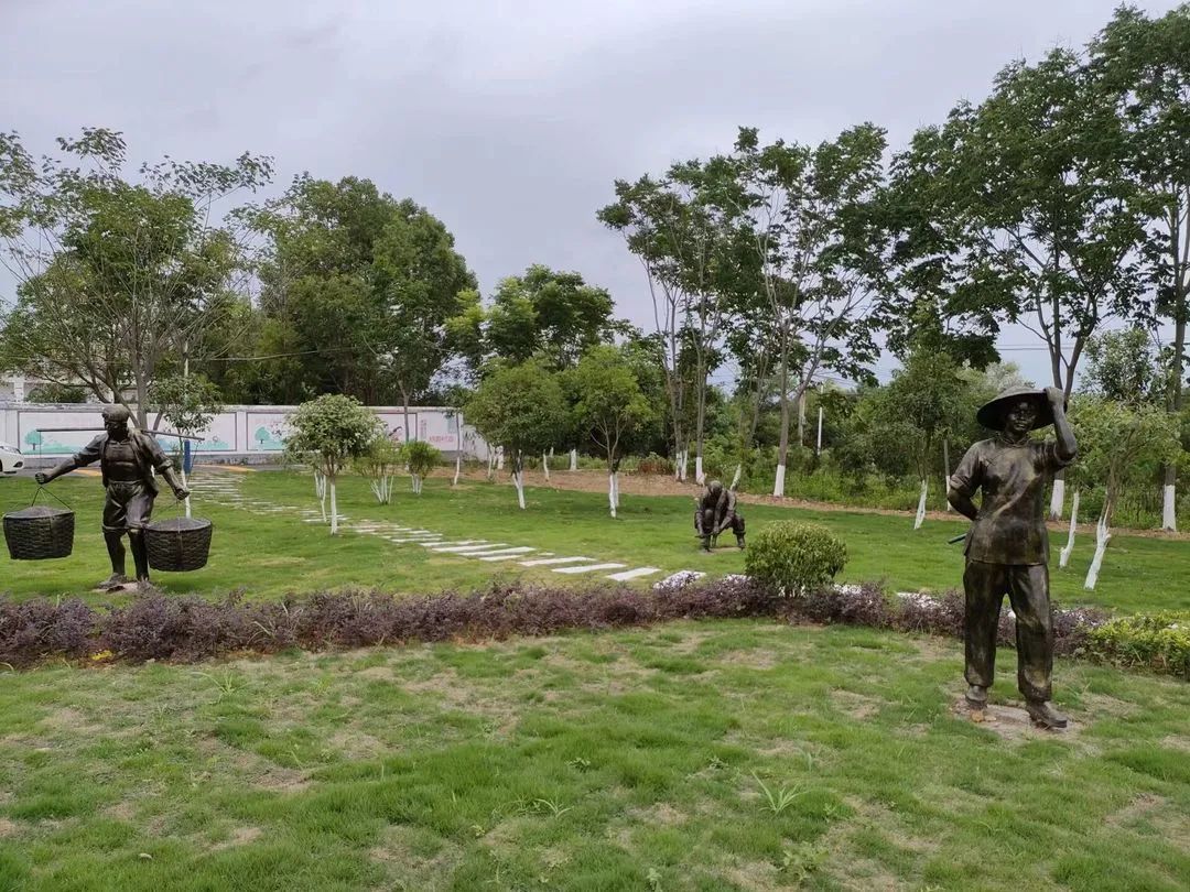 公园草坪面积达5000多平方米,一座座充满着泥土气息的农耕文化雕塑矗立其间,各种花草树木高低相间,错落有致。一条由青石板铺成的蜿蜒小路向草坪深处延伸,青砖黛瓦构筑而成的围栏陈列在东环线道路两侧,道路以西,候车亭、交通厕所、医务室、宣传长廊依坡而建,凉亭、休闲座椅点缀其间。