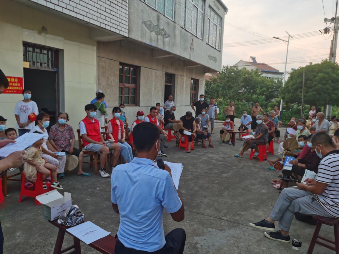 当天晚上,机关支部党员下沉到向新村杨家独屋参加屋场院子会。会场很快就围满了村民,大家听得很认真,讲解员们宣讲得也很耐心。