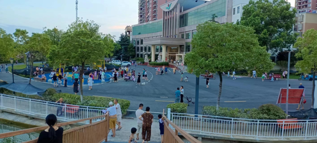 傍晚时分,镇区劳作了一天的人们来到景园湖休闲广场,有的散步,有的跳广场舞,还有的三三两两扎堆交谈,而孩子们都在儿童乐园惬意地跳着、蹦着。