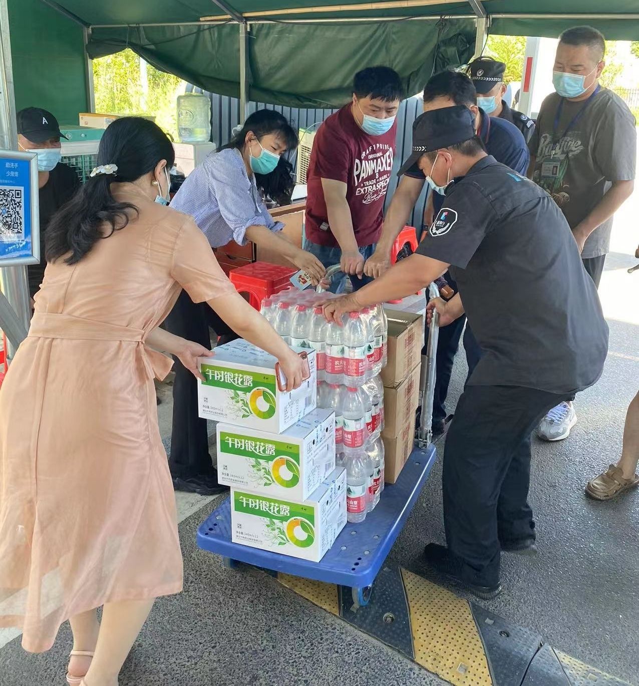 近日,持续不断的高温天气,给疫情防控执勤值守人员带来严峻“烤”验。8月8日,孝南区政数局党组成员带队组织开展“炎炎夏日送清凉”慰问活动,为进出入口值守的防疫工作人员、保安和物业人员送去矿泉水、金银花露、酸梅膏等解暑饮品。
