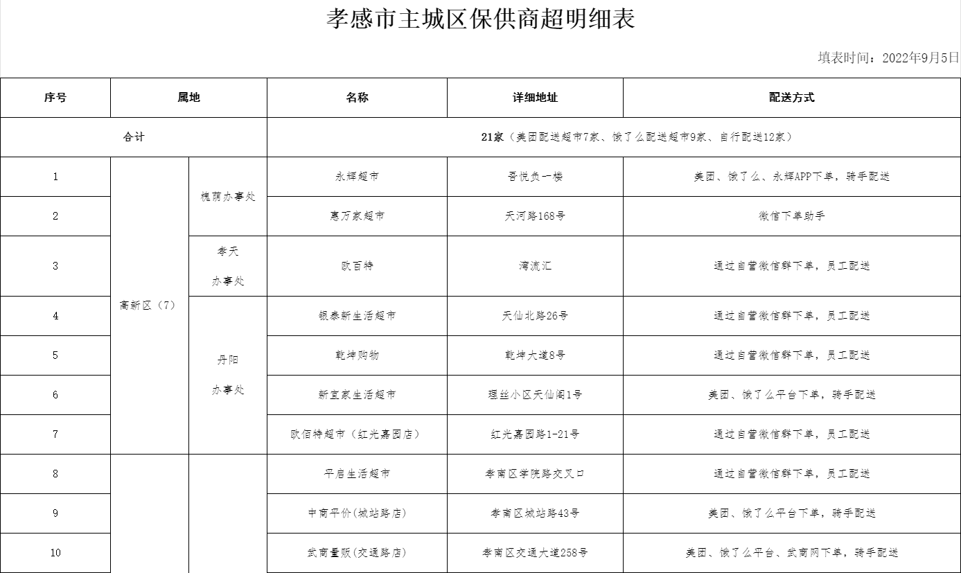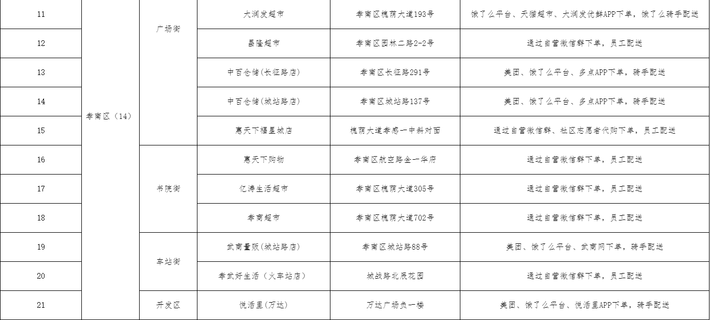 感谢大家的支持和理解,为了保障好孝感主城区静默管理期间的生活服务工作,孝感主城区设第一批保供商超21家,设保供药店16家(名单附后),实行线上下单,线下配送与代购配送相结合的保供模式。