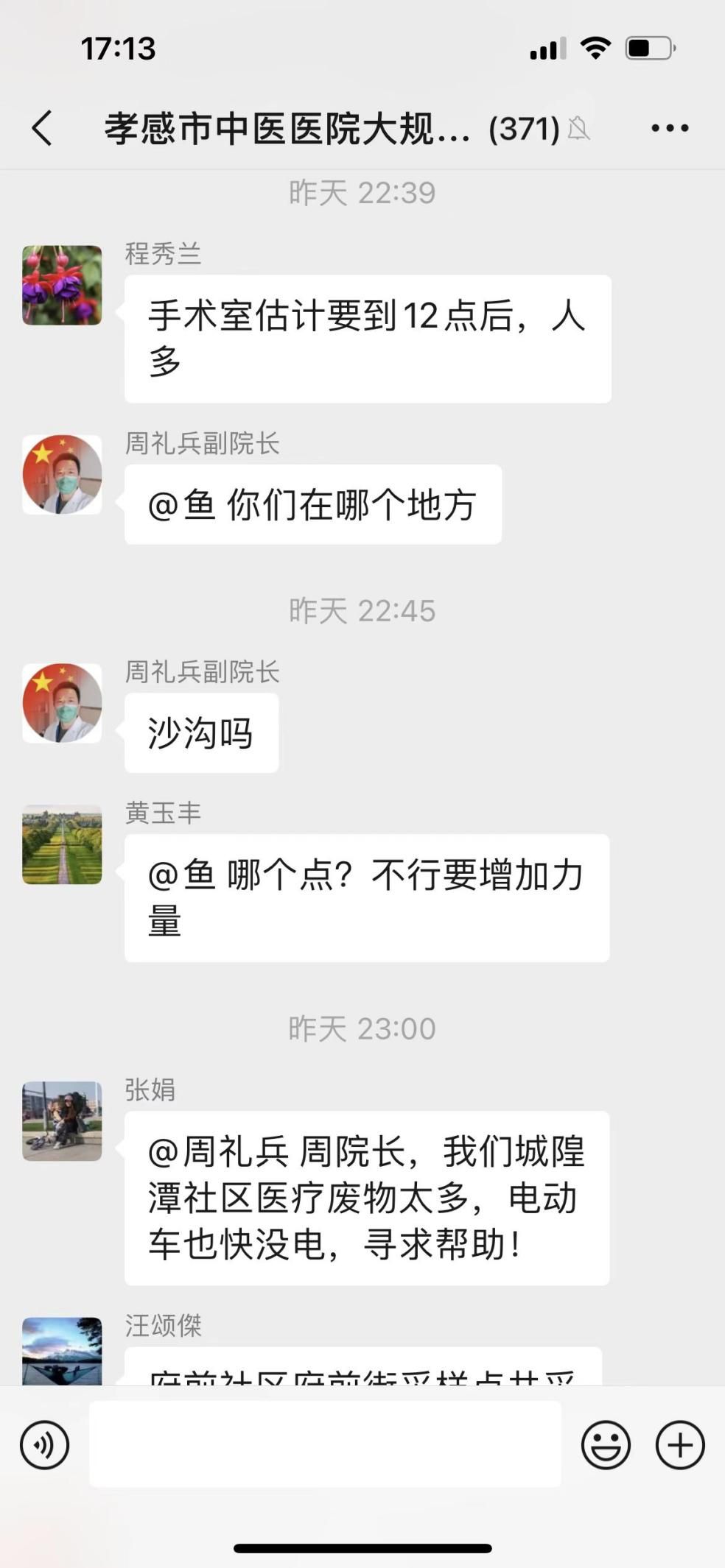 “手术室采样组估计要到12点以后,等待采样的居民较多。”“城隍潭社区医疗废物较多,电动车快没电了,康复科采样组请求帮助。”
