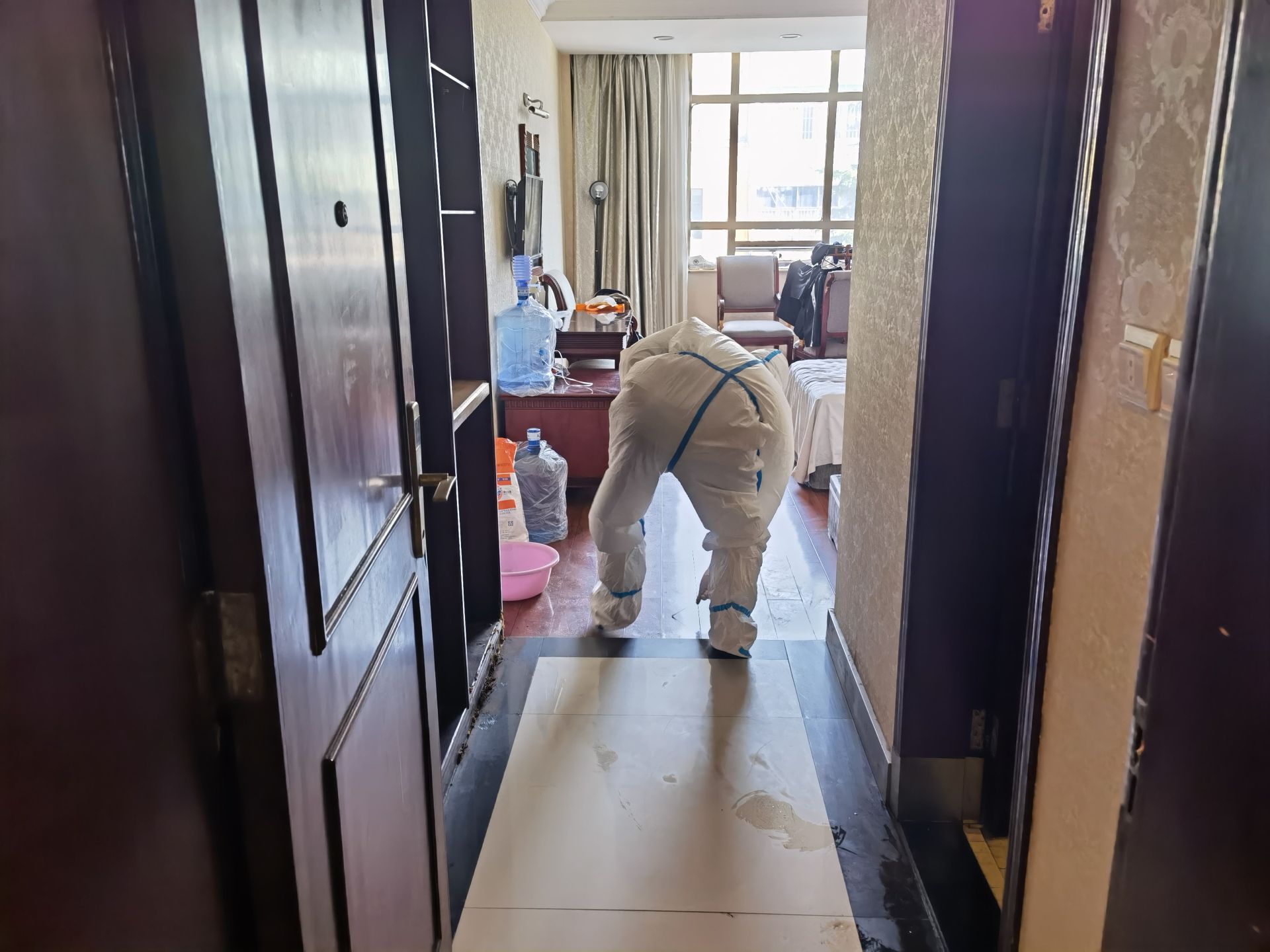 除了每日的隔离人员采样,环境采样也是必不可少的。按照要求,常规一周两次环境采样,包括隔离点清洁区、污染区和半污染区,分别采取触摸频次或使用频次最多的地方,如电梯按钮、开关扭、水龙头、门把、马桶盖、电脑键盘、手机等常用地方的样本。还有每两周检测一次的化粪池核酸样本,确保集中隔离点环境无污染,这便是他们难得的出酒店大门的放风时间,久违的阳光晒在身上暖暖的,王明强那骑扫帚的调皮样子,看在拍照的同事眼里,暖在心里。