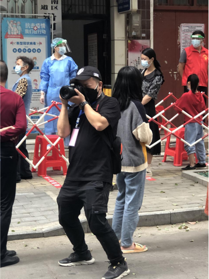 “诶,你说我们像不像电驴小分队啊!”一路上,大家沿着能够通行的道路,见到场景就停下来采访拍摄,看到交警值守卡口,连忙拍摄他们工作的画面;看到关闭的商超,就拍摄静态管理画面;就这样一路上拍摄采访了核酸采样点、交通卡口、商超药店、社区等,大家一边拍摄一边写稿,第一时间回传给后台人员,形成了一体化的联动工作模式。