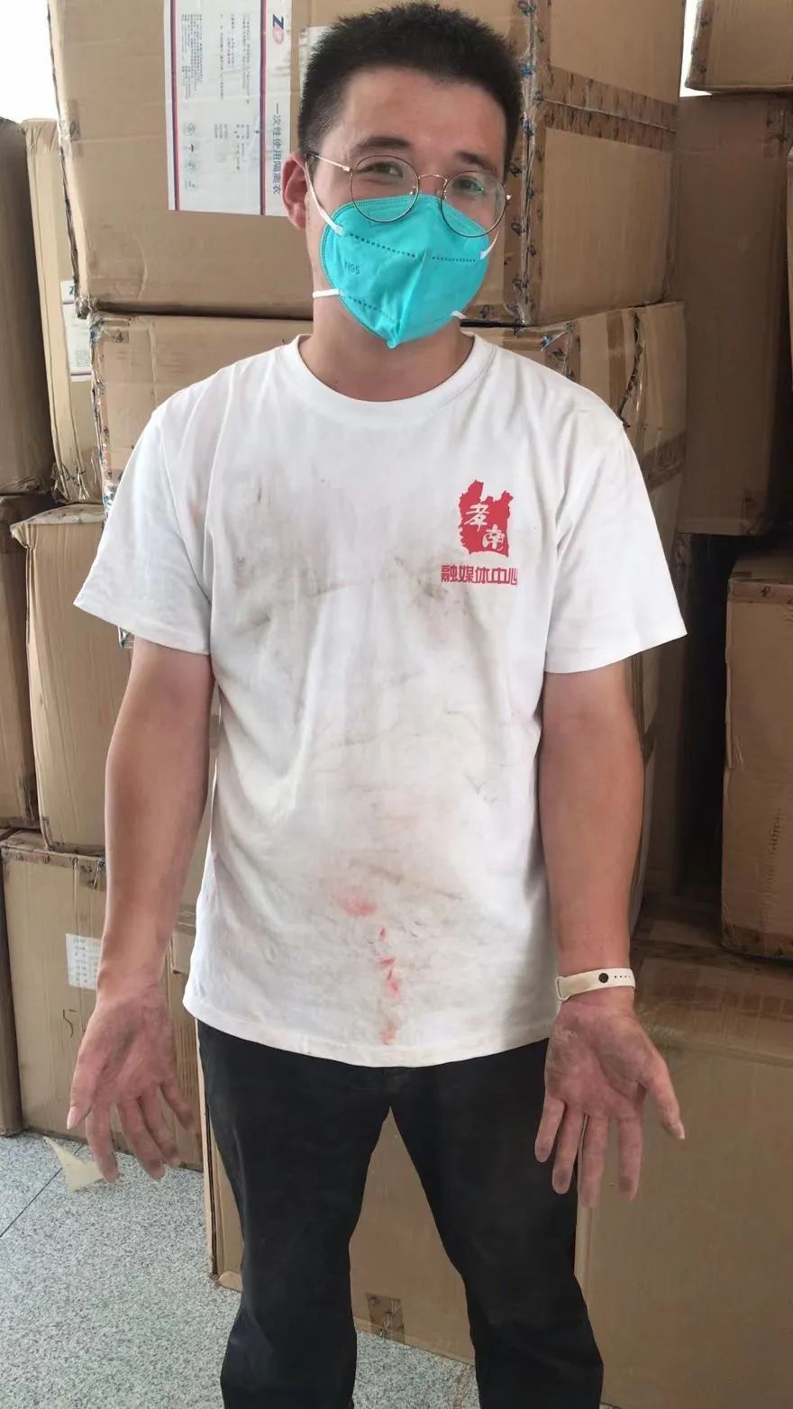 顶着炎炎烈日,卸货的过程持续了2个多小时,结束后大家精疲力竭,赵程一身白T恤也“面目全非”,他自我调侃道:“今天当了一回搬运工,这是我劳动的光荣印记!”