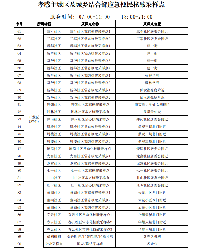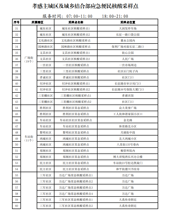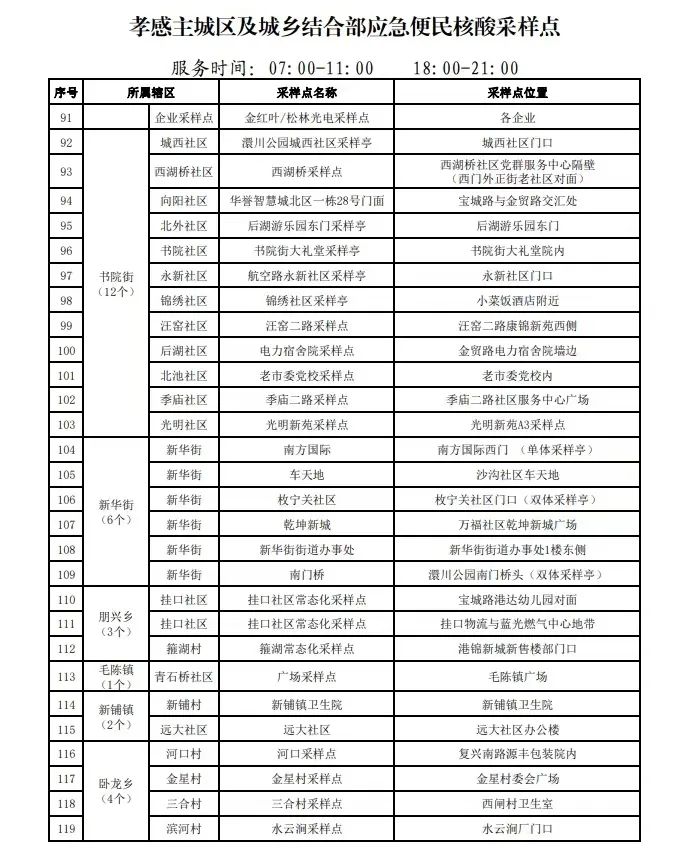 为方便居民核酸采样,现将孝感主城区及城乡结合部应急便民核酸采样点予以公布,请广大居民就近到采样点有序进行核酸采样。