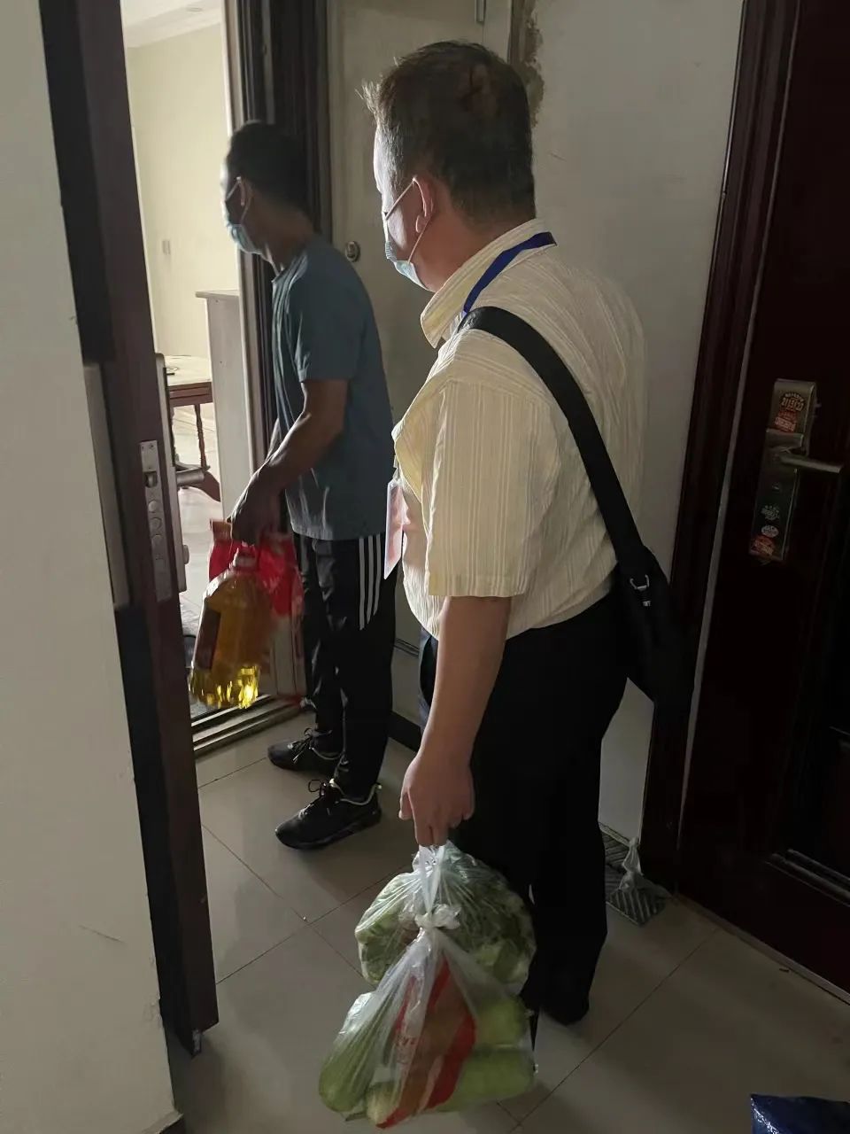 在联城社区,队长张亚斌正带领着队员们帮助社区工作者们清点刚刚运到的物资。他们按照小区单元、居家隔离住户数量进行了分配,每袋物资包括胡萝卜、黄瓜、马铃薯等果蔬,可以满足普通家庭3到4天的需求。稍后他们即将参与联城社区组织的特困人群慰问活动,为空巢、独居老人及行动不方便人群上门配送物资,全面助力打通群众急难愁盼的“最后100米”。