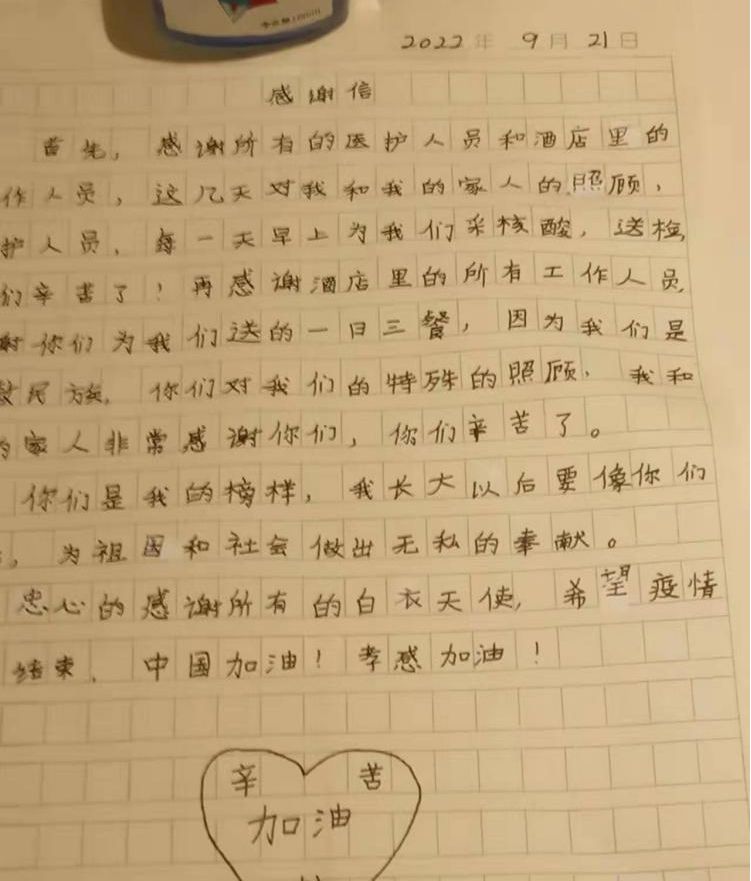9月17日,接到区疫情防控指挥部通知将要转运一批集中隔离人员到酒店隔离点,接收转运的工作人员发现送来的隔离人员中有四名回族人员。为此,点长主动向区民宗局汇报情况,咨询生活习惯,并及时和回民电话沟通。为充分尊重少数民族的生活习惯,隔离点专门协调回民餐厅按时送餐,彻底解决回民的后顾之忧。9月24日,隔离人员隔离期满后,保洁工作人员例行打扫时,在床头发现了这封手写的感谢信,回族小朋友情感真挚一笔一划地表达了自己对医护人员和隔离点全体工作人员的感谢。