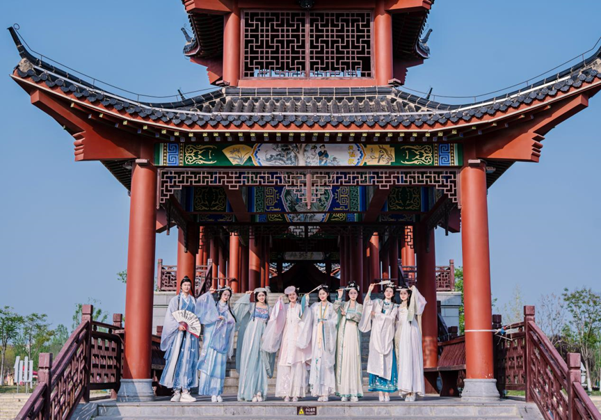 园区内建设的凤凰桥、金鹊桥、银鹊桥、金凤桥、银凤桥、凤凰廊桥、新白渡桥、雨花桥8座大桥和若干座小桥形态各异,各具特色;十里人工河碧波荡漾,河岸柳枝轻扬,喷泉水景引人注目;悠悠风情街,绿色成荫,古灯典雅,美不胜收;唐风建筑群与樱花园、桃花园、荷花园一年四季花不断相互映衬,带给游客重回盛唐的梦幻体验。