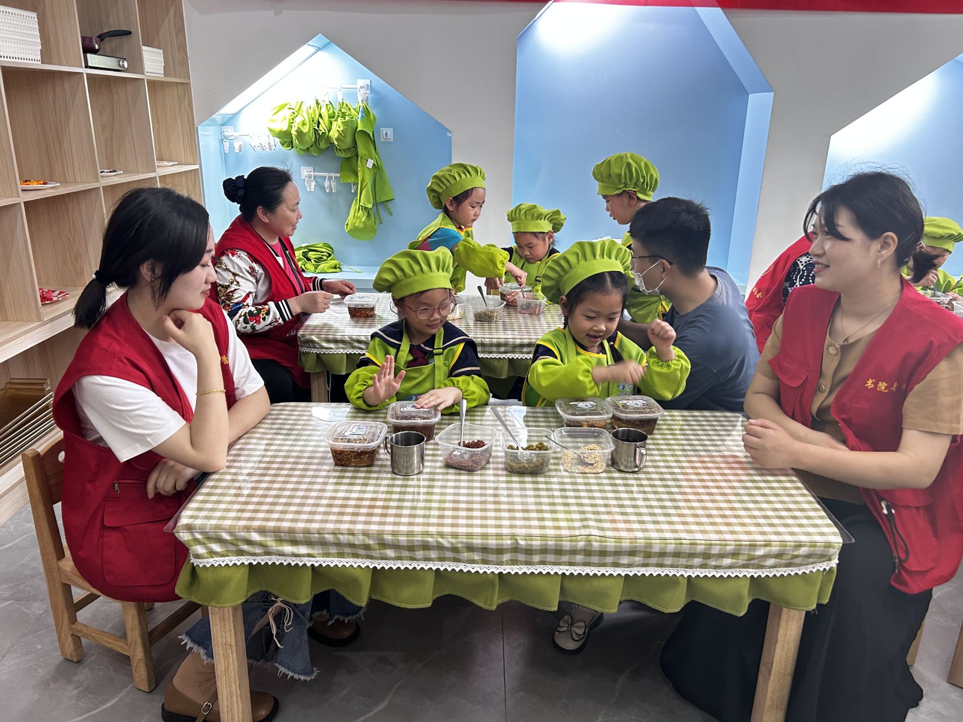 接下来,“城西大妈”志愿者与安华幼儿园孩子一起制作凉粉,在幼儿园区老师的指导下,小朋友们将冰粉籽来回揉搓,慢慢地凉水开始变得粘稠,直至冰粉籽揉搓不出粘稠液体,然后倒入沉淀好的石灰水,快速搅拌均匀,放入冰箱冷藏至果冻状,就这样夏日里冰爽降温、软糯弹牙的“解暑良品”就制作完成了。活动最后,“城西大妈”志愿者与安华幼儿园孩子共同将亲手做好的“凉粉”送到沿线的劳动者手上。这一碗“小小”的凉粉,蕴含着对炎炎烈日下依然坚守岗位、挥洒汗水劳动者的崇高致敬。