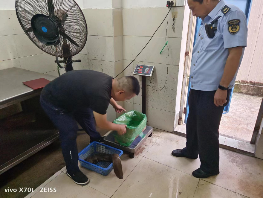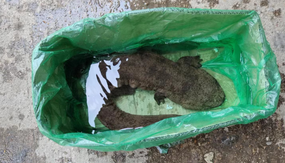 接报后,区农业综合执法大队迅速组织三汊镇农办一同前往。经执法人员现场观察,确认该怪鱼为国家二级水生野生保护动物成年娃娃鱼(学名:大鲵,属有尾两栖动物)。老张高兴的将娃娃鱼交到农业执法人员的手中,并且告诉执法人员一颗悬着的心终于放下了。该尾娃娃鱼于当日下午,由区农业综合执法大队派专车护送到湖北省水生野生动物救护中心。经救护中心专家检测该尾娃娃鱼体表完整无伤害,体重1.7公斤,体长70cm。由于张水桥对保护野生动物的高度认识,执法人员的迅速出击,使二级水生野生保护动物娃娃鱼得到成功救护。