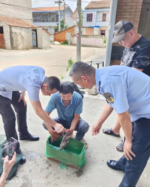 近日,孝南区农业综合执法大队接到三汊镇草店村村民张水桥电话报告,称自己在居住的村湾附近的河沟内捕龙虾时,意外捕到一尾长有四条腿的怪鱼,重约2公斤。此刻引来附近七里八乡村民的围观,不时发出婴儿般的哭声,疑似娃娃鱼。张水桥觉得我们这里虽然没有见过娃娃鱼,但发出的哭声引起了张水桥的高度重视,因避免该鱼发生意外,随即向孝南区农业综合执法大队电话报告。