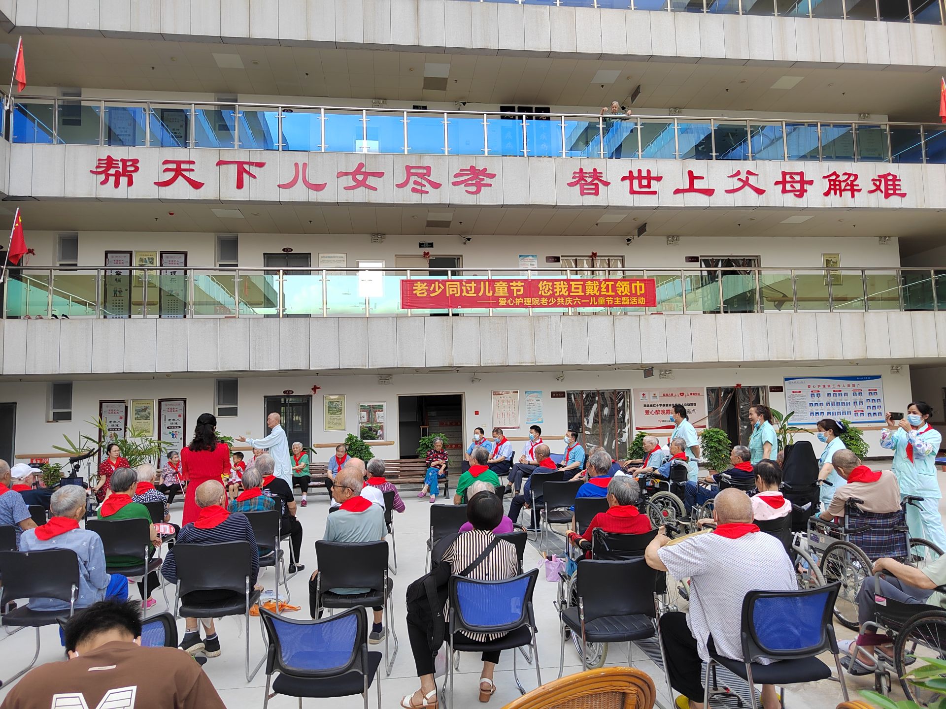 6月1日,孝感市第一人民医院爱心护理院小广场里,100多位老人和儿童,个个戴着红领巾,鲜艳的红领巾映照着一张张欢乐的脸,稚嫩的童声、爷爷奶奶的欢笑声不绝于耳,场面热烈而温馨。