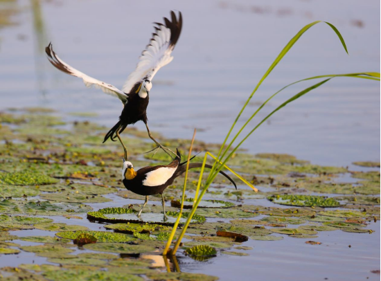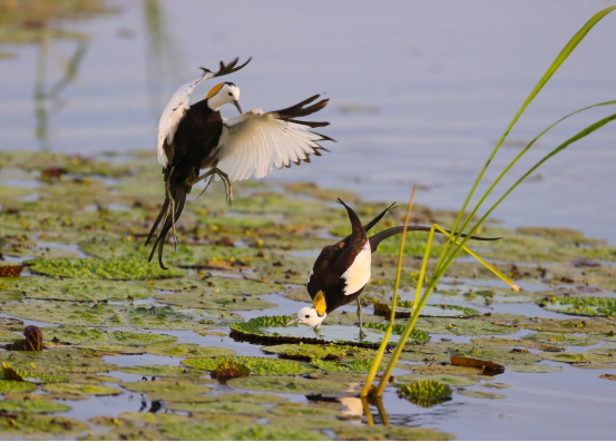 水雉生活在热带及亚热带的开放性湿地中,主要为淡水湖沼。因其有细长的脚爪,能轻步行走于睡莲、荷花、菱角、芡实等浮叶植物上,且体态优美,羽色艳丽,被美称为“凌波仙子”。水雉是一种对环境十分挑剔的水鸟。老话说,良禽择木而栖。水雉则是择水而居,一般环境不佳、人类不友好、水质Ⅱ类以下的地方,是很难留住它们芳心的,也难觅仙踪。“朱湖是湖北省重要湿地,也是湖北省近零碳排放示范试点区,环境优美了,百鸟用翅膀鼓掌,用脚步检验,也用在这里安家落户、生儿育女来肯定。”朱湖国家湿地公园管理处湿地中心负责人告诉我们,这几年朱湖不断加大生态修复和保护力度,用湿地建设的实际效果爱鸟留鸟。