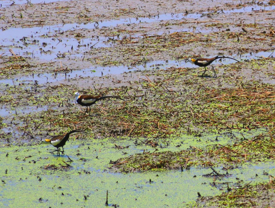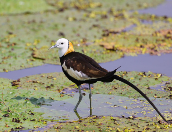 “这是水雉,又称凌波仙子,它们能在芡实叶子上自由行走,筑巢孵仔,姿态轻盈,十分好看。”朱湖国家湿地公园管理处鸟类监测技术人员池清华说,“别小瞧了哦,它们可是国家二级野生保护动物,还是国宝哩!”水雉(拉丁学名:Hydrophasianus chirurgus),也称水鸡子,是鸻形目水雉科的一种中小型鸟类,分布于中国南方、南亚次大陆及东南亚等地区。在朱湖区域为夏候鸟,春季于3月末至4月上旬迁来繁殖,秋季于9月末至10月上旬离开,中间有半年时间在朱湖渡过。