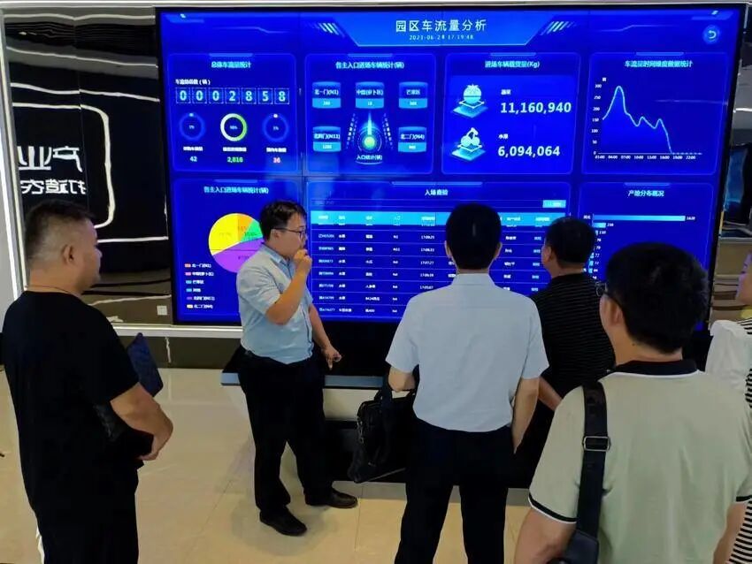 在园区智慧化管理系统平台前,考察组可以清清楚楚地看到进出园区的每一辆货车的信息,可以看到当天的车流量分析、价格指数分析等数据,在蓝色的大屏幕上,代表们看到芒果平均价8.40元、荔枝平均价12.06元、榴莲平均价21.48元,大家纷纷惊呼,“这儿的水果真是便宜!”