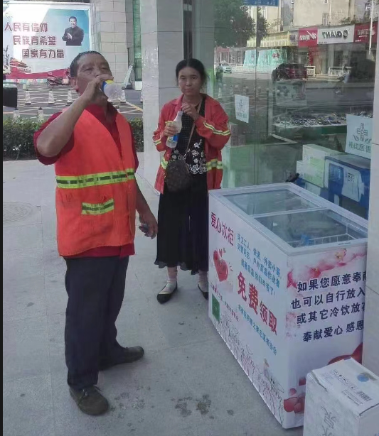 环卫工人在爱心冰柜站点取用矿泉水,纳凉解暑