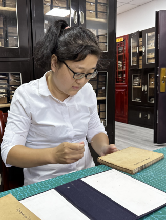 穿针引线,丝线从书脊原眼向下穿入,再把丝线捋平、拉紧,右手拉紧线头,左手捏住书脑将书册翻身,针再自上而下自第二眼穿出……古籍修复人员开始了古籍断线的修复工作。孝南区图书馆2022年度湖北省历史文献修复项目的基础维护项目于2023年8月8日正式启动。